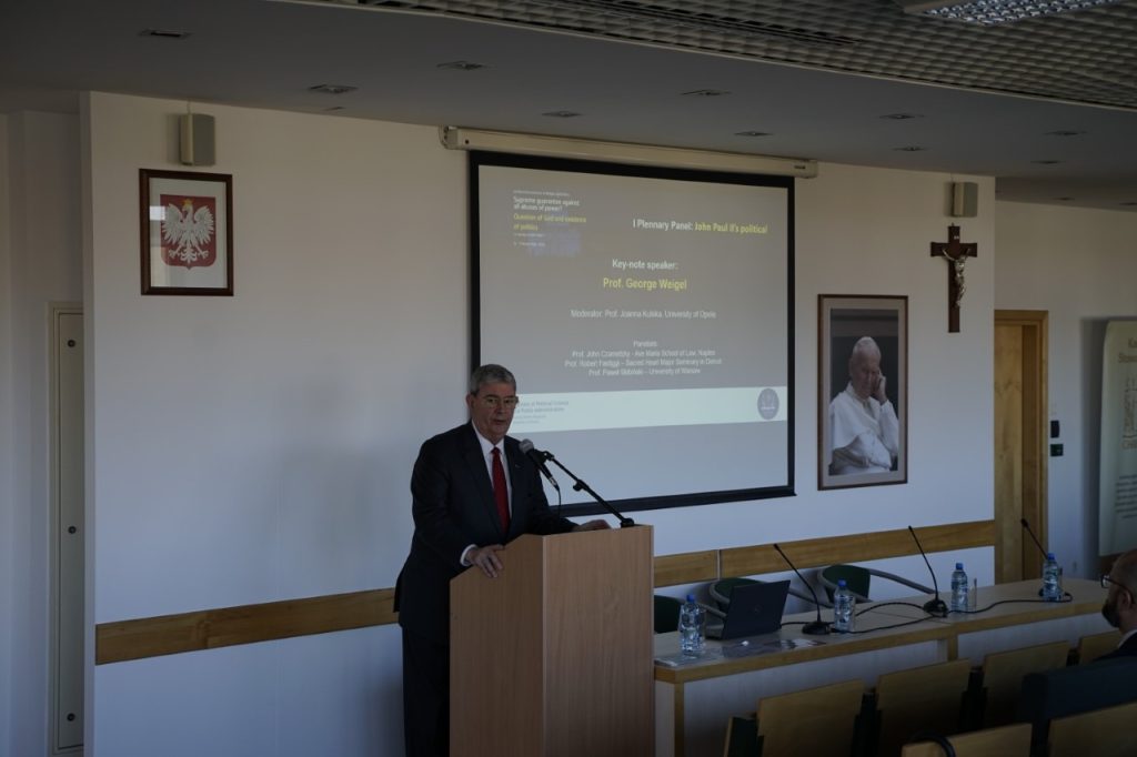 – Czy Jan Paweł II wciąż do nas dzisiaj przemawia? – pytał prof. George Weigel w wiodącym wystąpieniu pierwszego panelu plenarnego, moderowanego przez prof. Joannę Kulską z Uniwersytetu Opolskiego. Prelegent przywołał słowa kard. Ratzingera na temat dyktatury relatywizmu moralnego i Jana Pawła II na temat kruchości demokracji. Podkreślił, że nie da się wyrugować wolności opartej na prawdzie i solidarności z prawdziwie demokratycznego społeczeństwa. Pluralizm opinii jest wartością i osiągnięciem wtedy tylko gdy służy dobru wspólnemu. Prof. George Weigel skonstatował, że w dwadzieścia lat po śmierci Jana Pawła II, zdaje się, oddalamy się od prawdy, tracąc oparcie w swych kulturowych korzeniach. W dyskusji nad problemami poruszonymi przez prelegenta wzięli udział prof. John Czarnetzky (Ave Maria School of Law), prof. Robert Fasstigi (Detroit Seminary) oraz prof. Paweł Skibiński (Uniwersytet Warszawski).