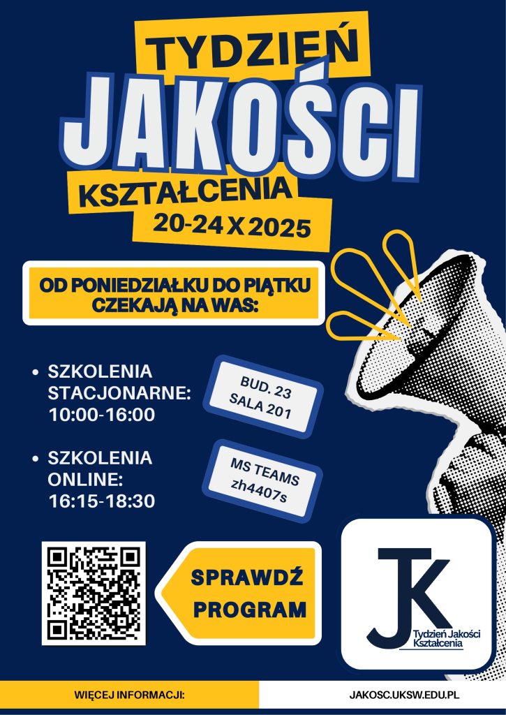 Odbywający się w dniach 20-24 października 2025 r. VI Tydzień Jakości Kształcenia to okazja do spotkania całej naszej społeczności, mającego na celu doskonalenie jakości kształcenia i budowania wspólnoty akademickiej.