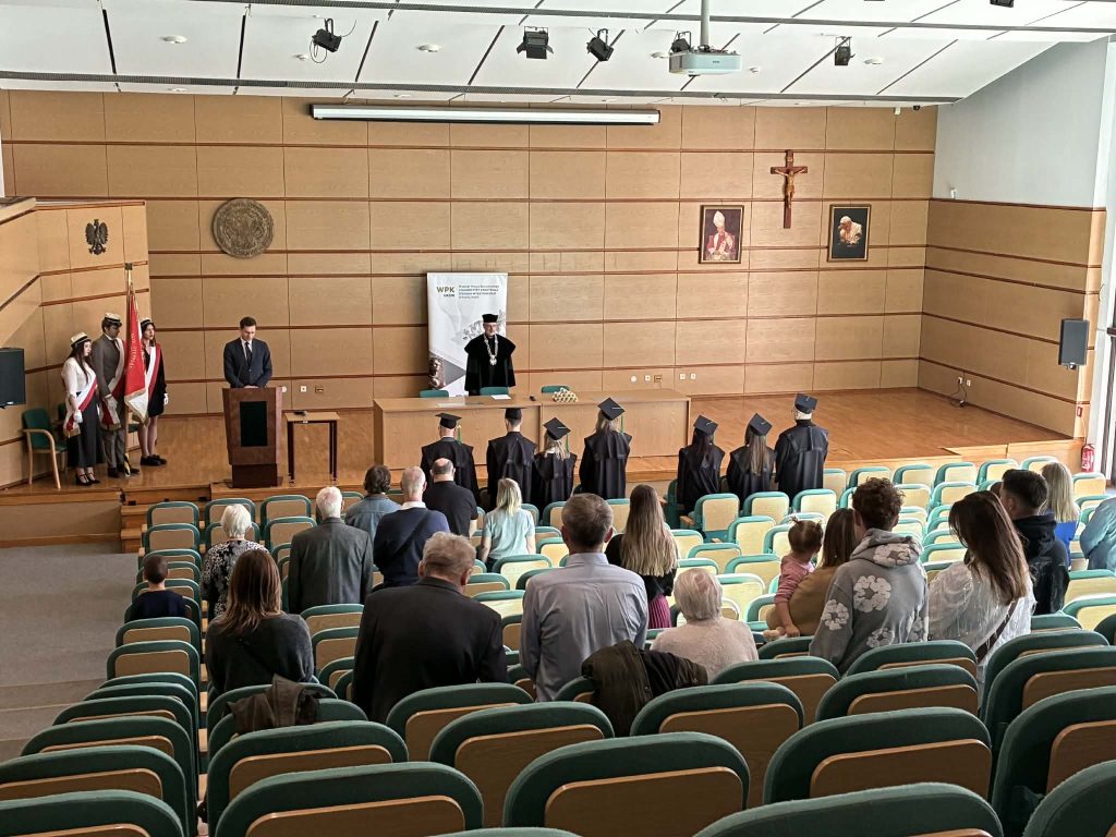 Uroczystość rozpoczęło wprowadzenie na Aulę Jana Pawła II sztandaru UKSW oraz odśpiewanie pieśni „Gaude Mater Polonia”. Następnie głos zabrał dziekan WPK – ks. dr hab. Dariusz Borek, prof. ucz., który podziękował absolwentom za czas spędzony na Uczelni oraz życzył im powodzenia w życiu osobistym i zawodowym.