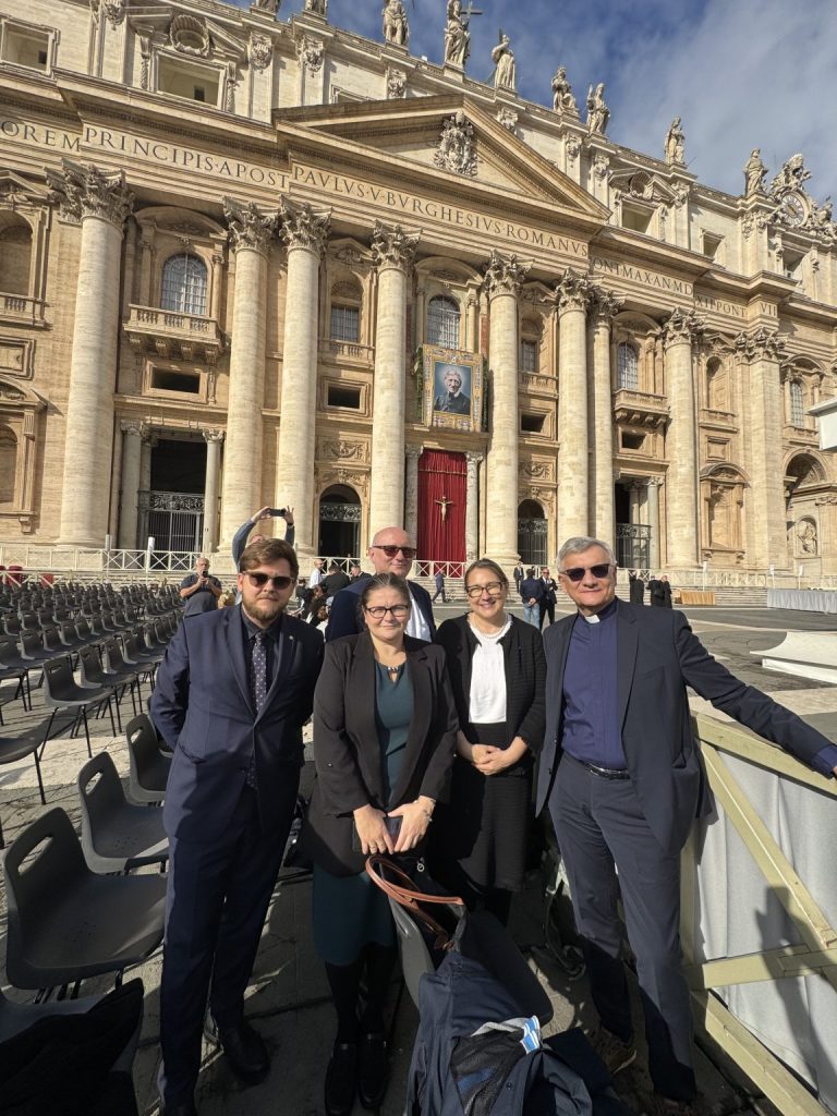 Od lewej: dr Igor Kilanowski, dyrektor kancelarii rektora UKSW, dr hab. Aleksandra Syryt, prof. ucz. z Wydziału Prawa i Administracji UKSW, ks. dr hab. Marek Stokłosa, prof. ucz., prorektor ds. kadr i projektów (z tyłu), dr hab. Barbara Strzałkowska, prof. ucz., prodziekan Wydziału Teologicznego UKSW, ks. prof. dr hab. Ryszard Czekalski, rektor UKSW. W oczekiwaniu na audiencję z papieżem Leonem XIV.