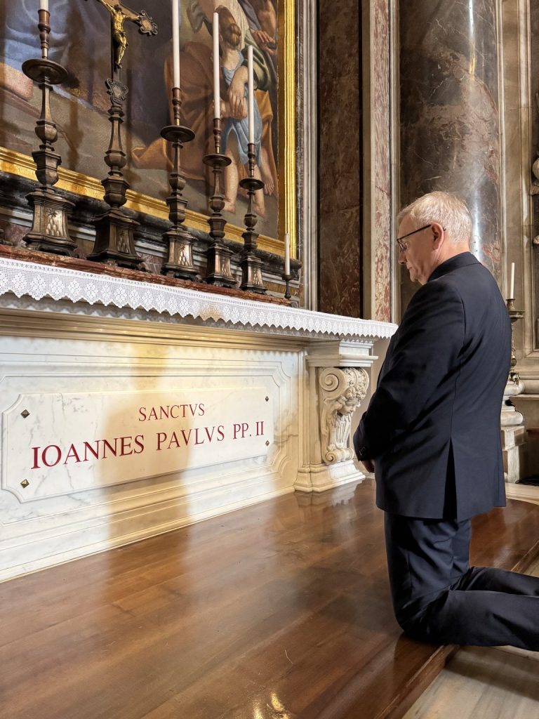 Ks. prof. Ryszard Czekalski modli się przy grobie św. Jana Pawła II.