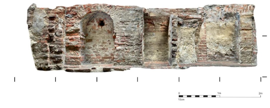Widok na relikty zachowanych pomieszczeń piwnicznych w murze nr 2; przylegający mur nr 7 do wnęki zakończonej łukiem oraz pomieszczenie piwniczne pierwotnie zwieńczone sklepieniem kolebkowym – podtrzymywanym przez mur nr 8. Widok od W, Ortofotografia skan 3D, nr inw. 68, M. Chrzanowski.