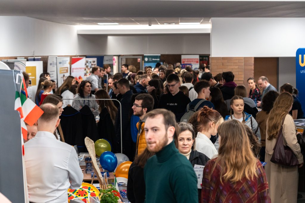 Nasz Dzień Otwarty miał swoją dynamikę i dramaturgię. Na scenie głównej powstało zaimprowizowane studio telewizyjne. Każdy zainteresowany naszą ofertą mógł dowiedzieć się, jakie kierunki oferuje uczelnia, jak wygląda rekrutacja krok po kroku, jakiego wsparcia udzielamy studentom oraz jak wziąć udział w programie Erasmus+.
