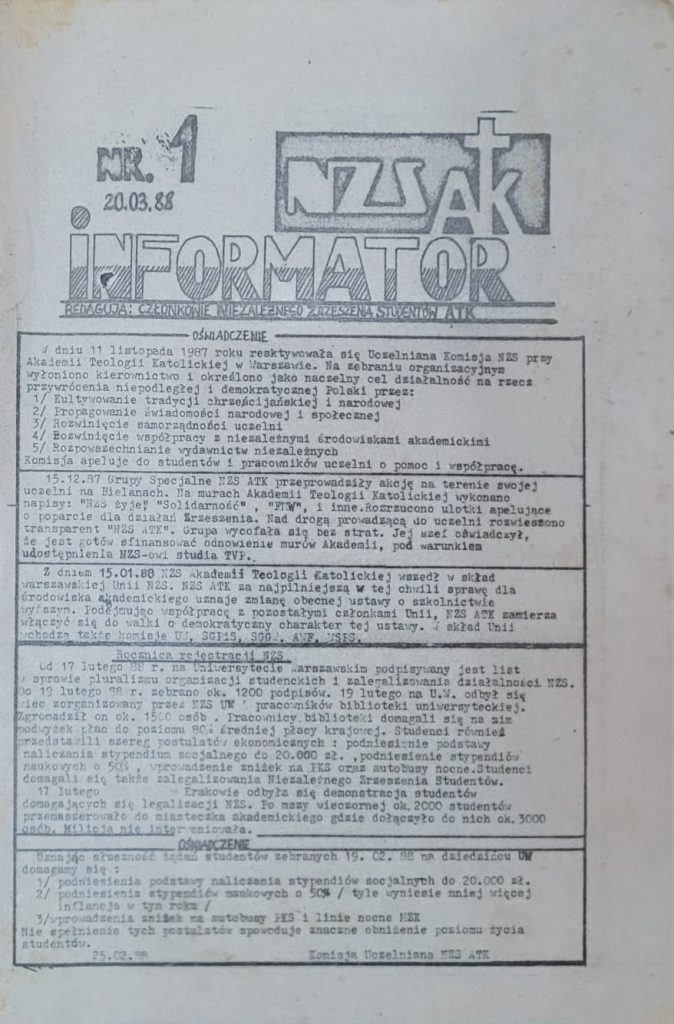 Przypomniał, że w 1988 r., w 48. godzinnym spektakularnym strajku okupacyjnym na UW, wzięła udział liczna grupa studentów z ATK, z własnym transparentem. Także podczas strajku w maju 1988 r. NZS ATK miał swoją reprezentację na terenie UW, dzięki czemu protest mógł zostać zauważony.