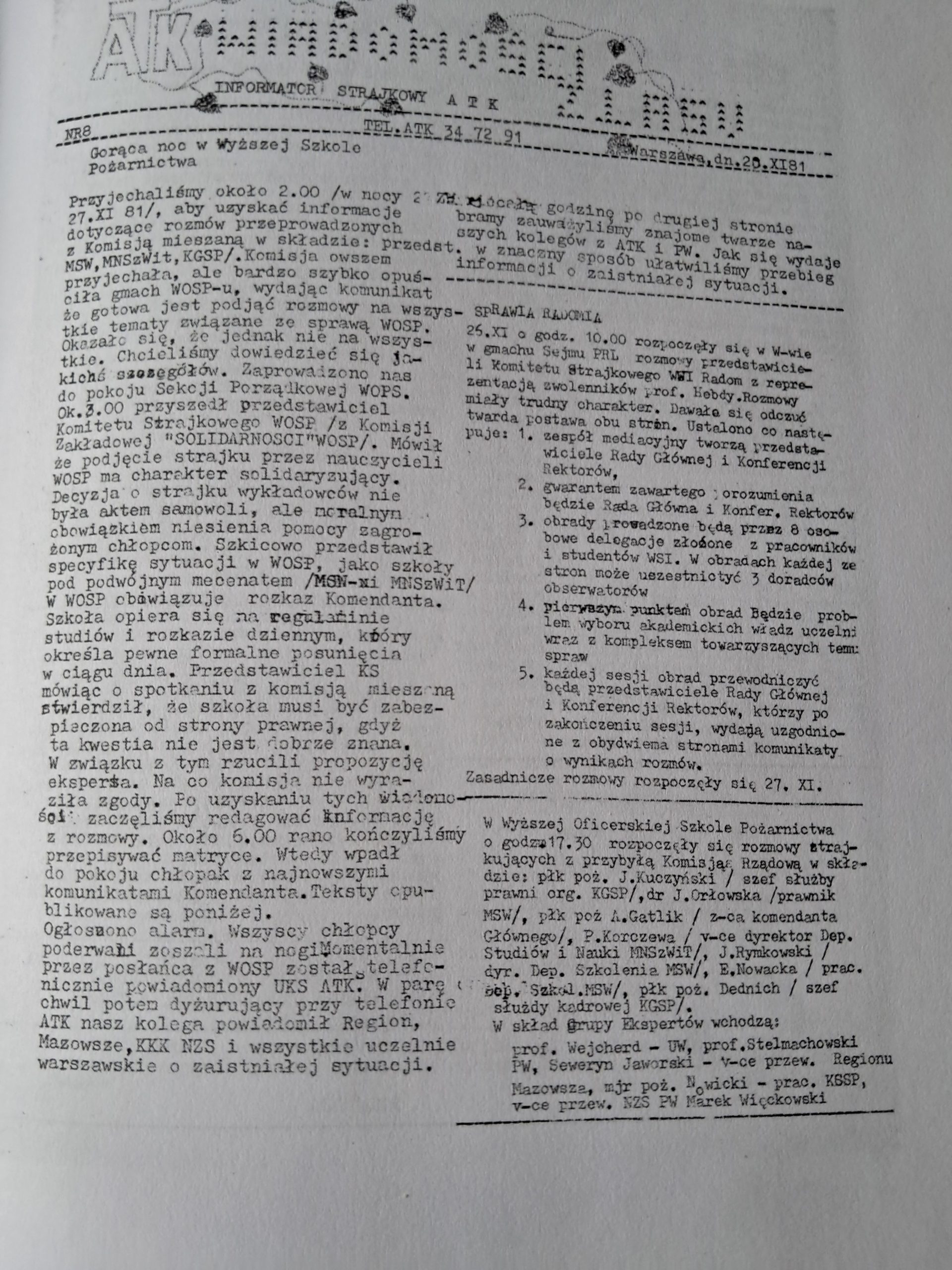 Przybyli na konferencję weterani NZS podkreślali, że zrzeszenie na ATK oddalone od pozostałych uczelni, mimo przyłączenia się do rodzącego się niezależnego ruchu studenckiego, pozostawało początkowo w izolacji. Opowiadali, że sytuacja zmieniła się jesienią 1981 r. po przyłączeniu się Uczelni do ogólnopolskiego strajku studenckiego, zorganizowanego w geście solidarności ze strajkującą Wyższą Szkołą Inżynierską w Radomiu. 20 listopada zarejestrowano „Niezależne Zrzeszenie Studentów ATK w Warszawie”, a na Uczelni rozpoczął się strajk okupacyjny.