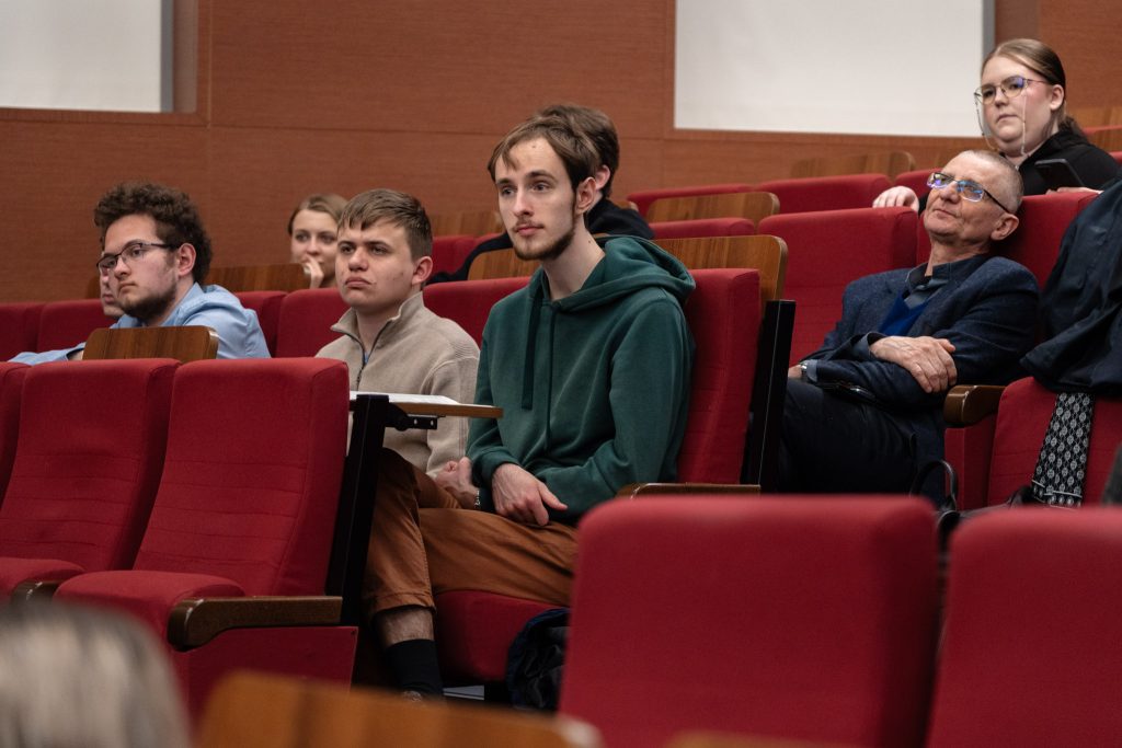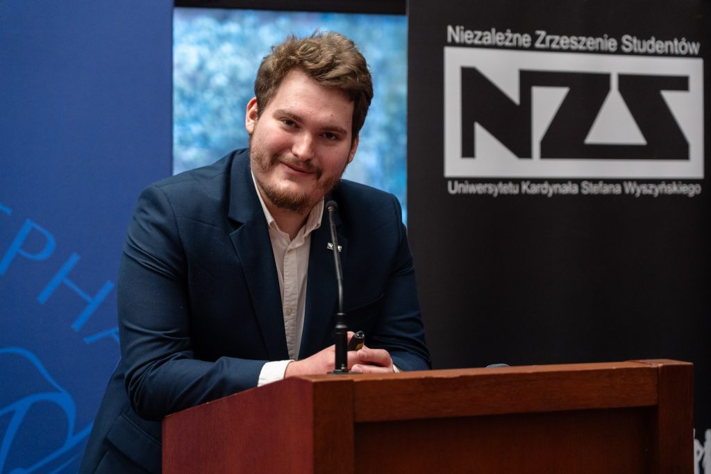 Jakub Adamczyk z Koła Studentów i Doktorantów Historii UKSW w krótkiej, treściwej prezentacji zarysował tło historyczne NZS, zaznaczając, że także dziś zrzeszenie może odgrywać ważną rolę, jako organizacja reprezentująca środowisko studenckie.