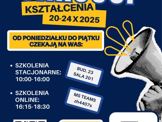 Sesje szkoleniowe w formie stacjonarnej odbędą się w budynku 23, w sali 201 na kampusie Wóycickiego. Każdego dnia w godzinach 16.15-18.30 przewidziane są szkolenia i webinary w formie zdalnej na platformie MS Teams (kod zespołu: zh4407s).