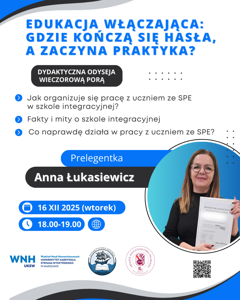 Zapraszamy na wyjątkowy webinar, inaugurujący nowy cykl spotkań „Dydaktyczna Odyseja Wieczorową Porą”, których inicjatorem i organizatorem jest społeczność koła naukowego Dydaktyczna Odyseja, działającego na Wydziale Nauk Humanistycznych UKSW.