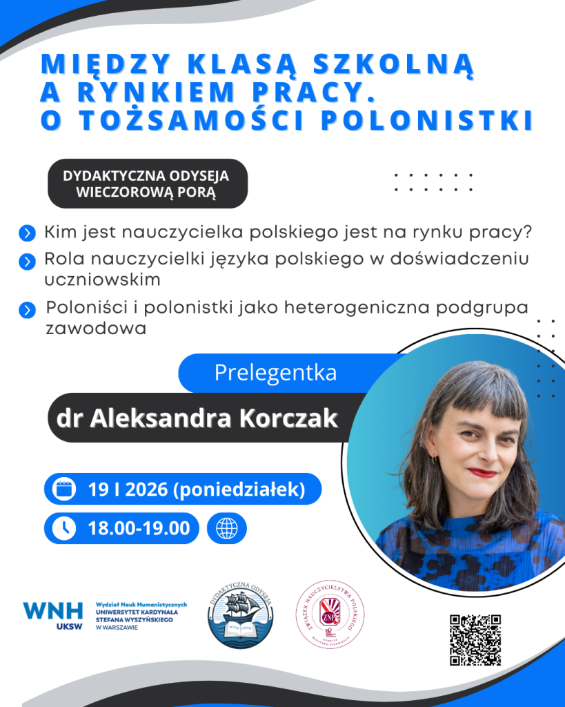 Webinar realizowany w ramach cyklu „Dydaktyczna Odyseja Wieczorową Porą”, którego inicjatorem i organizatorem jest społeczność Koła Naukowego „Dydaktyczna Odyseja”, działającego na WNH UKSW odbędzie się 19 stycznia. Partnerem cyklu spotkań jest ZNP Oddział Warszawa-Śródmieście.
