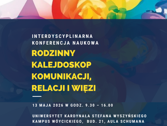 Wydział Studiów nad Rodziną UKSW zaprasza na konferencję naukową „Rodzinny kalejdoskop komunikacji, relacji i więzi”, która odbędzie się 13 maja 2026 r. w godz. 9:30 – 16:00 w Auli Schumana na kampusie Wóycickiego.