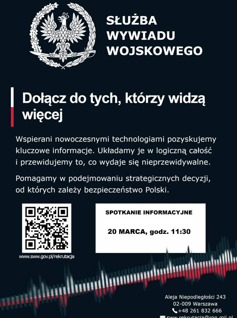 Biuro Karier UKSW zaprasza na spotkanie z przedstawicielami służb specjalnych, którzy opowiedzą jakie zadania i w jaki sposób są realizowane przez Służbę Wywiadu Wojskowego, jak wygląda proces rekrutacyjny i kto może się stać funkcjonariuszem.