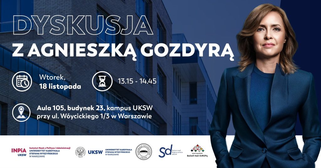 Spotkanie z red. Agnieszką Gozdyrą odbędzie się na Wydziale Społeczno-Ekonomicznym UKSW na kampusie Wóycickiego 18 listopada w godz. 13.15-14.45. Organizatorem wydarzenia jest Instytut Nauk o Polityce i Administracji UKSW, zaś partnerem Koło Naukowe Badań nad Europą.