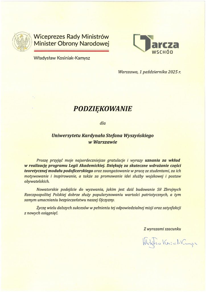 – Legia Akademicka to projekt realizowany w UKSW już od wielu lat. Istotny, zwłaszcza teraz, w dobie zawirowań geopolitycznych i toczącej się wojny na Ukrainie. Obrona cywilna i przeszkolenie wojskowe jak największej liczby obywateli, w tym młodych ludzi wpisują się nie tylko w potrzeby społeczne naszej Ojczyzny, ale również pozwalają uczestnikom szkolenia zdobyć wyjątkowe umiejętności oraz hartować ducha. Cieszę się, że nasz Uniwersytet i nasi studenci są docenieni przez Ministra Obrony Narodowej Pana Władysława Kosiniaka-Kamysza – wskazuje ks. prof. Ryszard Czekalski, rektor UKSW.